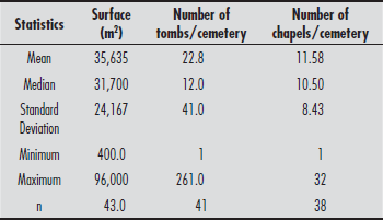 The land destined for the burial of the dead in the rural areas are of various sizes; 50% of them are of up to 31,700 m. in total area, with an average of 35,635 m. (Table 1). In these rural areas, there are small family cemeteries on private properties and larger ones for community use in each location. The number of graves and chapels per cemetery reflect the diversity and variation observed in the dimensions of the cemeteries in these areas. There are cemeteries with one tomb and chapel and others with 261 and 32 tombs and chapels, respectively.