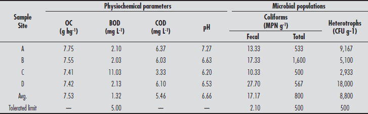 Soil samples (0.20-0.40 m depth) were collected in triplicate at four locations (points A, B, C, D) in the Central Cemetery (Fiorin, 2007), in accordance with the procedures specified by EMBRAPA (2011). Collected material was packed in plastic bags, stored in coolers and reached the laboratory within 4 hours from collection. Physicochemical analyses of organic carbon, biochemical oxygen demand (BOD) and chemical oxygen demand (COD) followed standard methods (APHA, 2005), considering five days at 20 °C up to 3 mg L-1 O.. The pH at 20° of a 5% soil suspension (w/v) was determined by potentiometry (Stutter et al., 2013; Daynes et al., 2013).