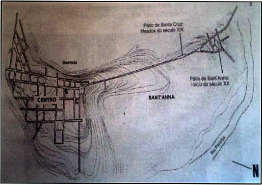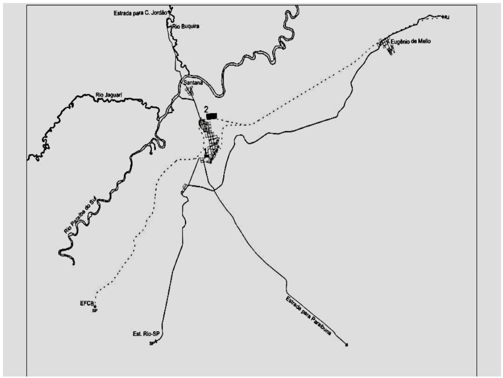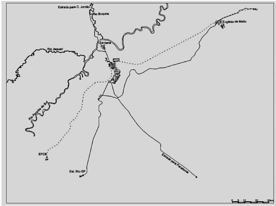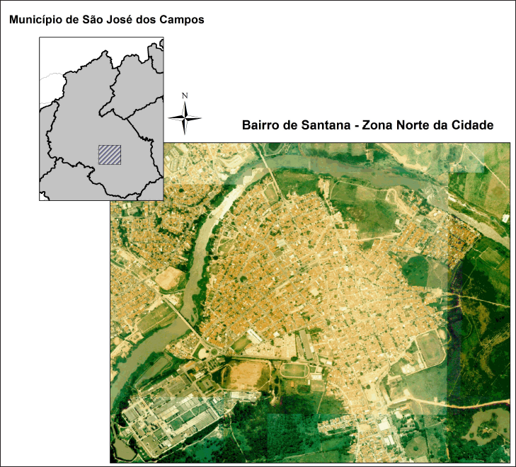 O bairro de Santana, localizado na região norte de São José dos Campos, teve início no final do século XIX em razão das atividades de tropeiros que utilizavam o lugar como caminho para Minas Gerais. Em 1868, Santana foi oficialmente reconhecido como bairro, lugar empobrecido, com pequenas casinhas e fortes características de isolamento em relação ao centro da cidade (Ramos, 2009, p. 79). No entanto, sua localização privilegiada (Figura 4), próxima ao rio Paraíba e à serra da Mantiqueira, tornou o bairro um local de permanência de tropeiros oriundos de Minas Gerais, fortalecendo o comércio na região.