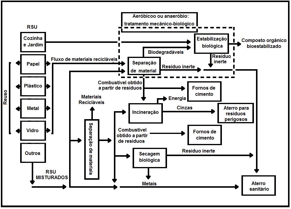 Para Economopoulos (2012), as alternativas de gestão podem basear-se nas tecnologias de tratamentos presentes na Figura 1. Entre as alternativas, destaca-se a separação dos resíduos recicláveis na fonte, sendo reutilizados ou reciclados. Os RSUs misturados podem ser tratados anaeróbica ou aerobicamente, de modo mecânico-biológico, obtendo, assim, materiais recicláveis, combustível (energia) e bioestabilizados orgânicos (fertilizantes/adubo). Os RSUs misturados também podem ser pré-tratados em instalações de secagem biológica, após a recuperação do material reciclável. O restante desses tratamentos será resíduo inerte, que não pode ser aproveitado e será direcionado ao aterro sanitário. A energia gerada pode ser exportada sob a forma de eletricidade e/ou calor, para aquecer o local, ou utilizada industrialmente. Por outro lado, cabe destacar que os resíduos com substâncias tóxicas devem ser eliminados em instalações apropriadas.