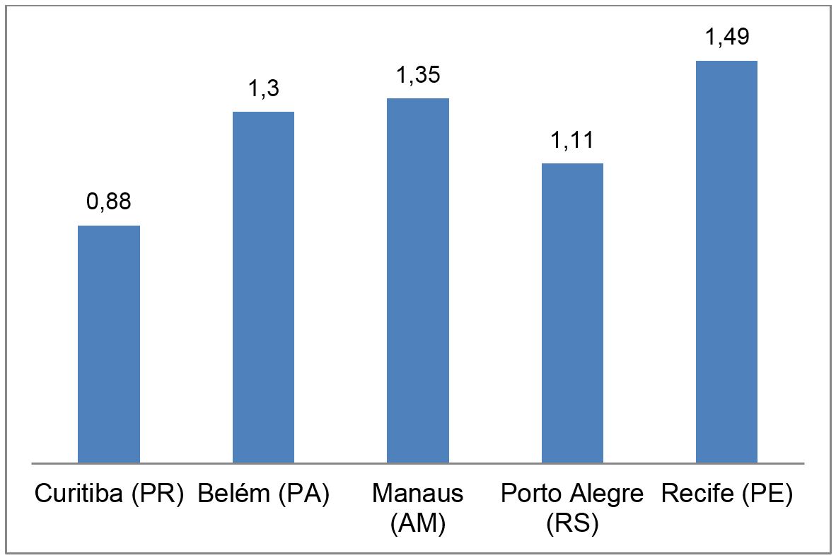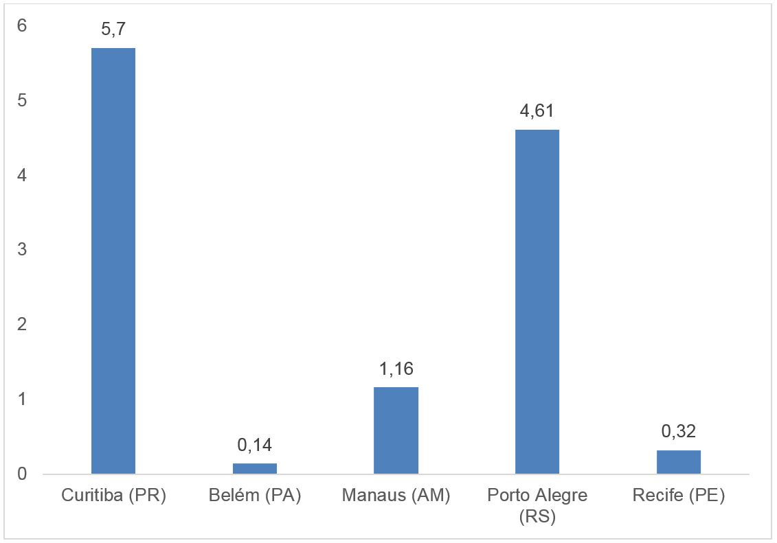 A questão do custo é uma preocupação porque há tendência de maior financiamento de todo o serviço pelo setor público, como demonstra a Figura 5. O custo crescente faz aumentar os recursos envolvidos com esse serviço público, os quais concorrerão com recursos orçamentários direcionados a outras funções sociais. Tal questão pode exigir um novo modelo de gestão e de financiamento dos serviços no futuro e merece destaque em termos de planejamento no momento, como ressaltam Moh & Manaf (2014). Contudo, o custo do serviço por habitante, se comparado ao de outras capitais brasileiras de mesmo porte, é menor (Figura 6).