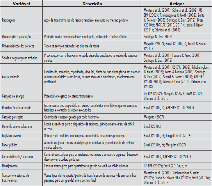 A primeira etapa utilizou a técnica de pesquisa documental, referindo-se essencialmente aos trabalhos discutidos na seção anterior. O produto dessa etapa foi a produção de um quadro relacionando à variável com sua definição e os autores que consideram tal variável relevante para a gestão municipal de resíduos sólidos urbanos (Quadro 1).