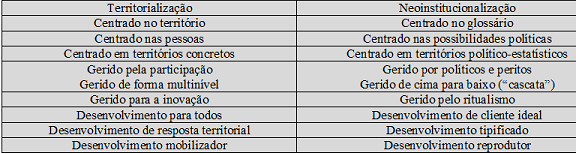 No Tabela 100, procura-se esboçar os resultados da análise efetuada, propondo um modelo de territorialização versus um modelo de neoinstitucionalização como hipótese para a compreensão do quadro de desenvolvimento 2014-2020 em Portugal.