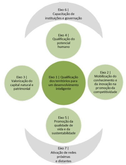 Fonte: Autores.O exercício de apresentação de uma estratégia e a definição de ações/projetos tem presente o contexto territorial, os ativos específicos e as potencialidades identificadas no quadro das possibilidades decorrentes da política e dos instrumentos de financiamento desenhados para a região e para o país. Deste modo, a definição da Estratégia para o território procura garantir o alinhamento com os novos desígnios estratégicos globais, assim como com o novo quadro de programação financeira a nível europeu (Europa 2020). A formulação de uma estratégia de futuro teve como objetivo primordial “tornar um território mais competitivo, do ponto de vista económico e de o dotar de uma maior coesão social e habitabilidade” (Fonseca, 2006).