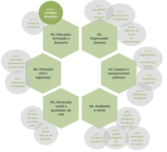 A título de exemplo, apresentam-se apenas as ações/projetos âncora uma vez que a área temática da educação aparece plasmada nesta área de intervenção nomeadamente no ponto A.1. Educação, formação e desporto e na tipologia de ação a.1.1. Território Educativo (Figura 4).