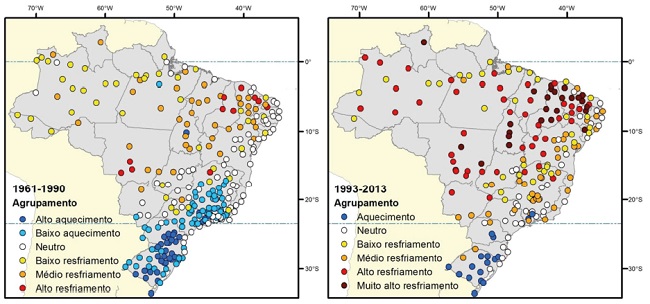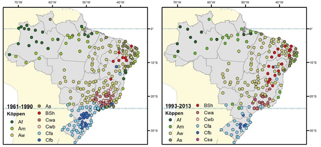As principais variações entre os dois mapas ocorreram, em geral, na Região Sudeste, com destaque para as estações em Minas Gerais. Há redução de ocorrências de climas temperados e aumento de climas quentes (Aw) e de estepes (BSh) a norte. Também ocorre o surgimento de um temperado úmido com verão quente e seco (Csa) a sul. No litoral do Espirito Santo, alguns locais que anteriormente eram climas de savanas aparecem como clima quente e úmido (Am). É importante destacar que há menos localidades na segunda classificação, isso explica, entre outros, a redução significativa de cidades em Cfa e Cfb na Região Sul.