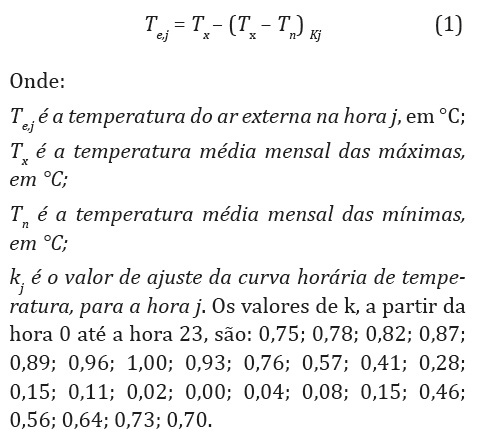 As variáveis ambientais utilizadas nesse artigo são: temperatura média compensada (°C), temperatura máxima (°C), temperatura mínima (°C) e precipitação acumulada mensal (mm). Contudo, para definição dos graus-dia de aquecimento são necessários valores horários da temperatura do ar que foram obtidos a partir das temperaturas do ar máxima e mínima mensais, que levaram aos dados horários médios mensais de temperatura do ar. A partir desse valor faz-se o ajuste dos dados locais à curva-padrão da WMO, mostrada pela Eq. 1 (Assis, 2001).
