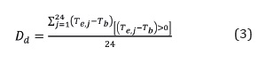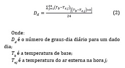 De acordo com Day (2006), o método mais rigoroso (e mais preciso matematicamente) de se calcular graus-dia é somar as diferenças horárias entre as temperaturas do ar e a temperatura de base e dividir por 24. Nesse cálculo, é importante que apenas os valores positivos sejam somados. Para calcular o número de graus-dia de aquecimento (GDA) quando a temperatura externa for superior à temperatura de base, o valor adotado de GDA para esta hora é zero. A Eq. 2 mostra a fórmula geral para este processo, considerando GDA.