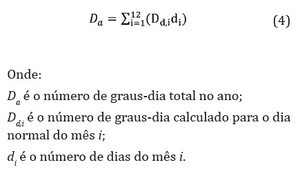 Os graus-dia são então somados pelo período definido, usualmente por um mês, uma estação ou um ano. Neste artigo, o número de graus-dia foi calculado para cada dia normal, definição já apresentada. Esse valor foi multiplicado pelo número de dias do mês e a soma efetuada para todos os meses do ano, para se obterem os valores anuais de GDR e GDA, conforme mostrado na Eq. 4.