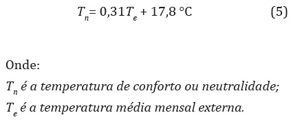 A temperatura de neutralidade pode ser definida por meio do modelo adaptativo de De Dear & Brager (2002), mostrado na Eq. 5. Esse trabalho segue o modelo tradicional de temperatura neutra, no qual Tn é uma temperatura do ar de neutralidade, definido pela temperatura média mensal externa, medido por estações meteorológicas locais. Destaca-se que este é o modelo clássico de determinação da temperatura neutra, presente em diferentes trabalhos como o de Auliciems (1981), Humphreys (1978)Nicol & Humphreys (2002) e De Dear & Brager (2002).