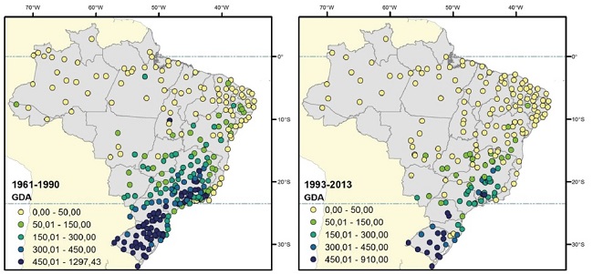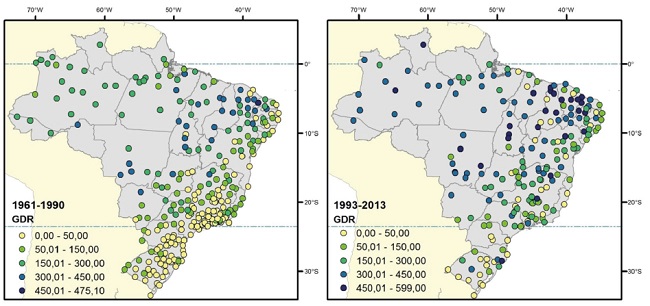 A variação do número de graus-dia obtida é apresentada nas Figuras 2 e 3, para GDA e GDR, respectivamente, para as séries de 1961-90 e 19932013. Os mapas por séries são apresentados lado a lado, e utilizam a mesma escala, para permitir melhor comparação.