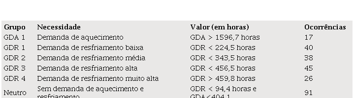 Para a base de dados climáticos de 1961-1990, analisando as ocorrências das cidades em cada grupo (Tabela 6), constatou-se que as cidades podiam ser divididas de acordo com a necessidade de GDR (baixa, média e alta), de GDA (baixa e alta) e de neutralidade. Deste modo, o agrupamento final das cidades de acordo com a necessidade de refrigeração e de aquecimento resultante foi o de seis grupos, denominados e classificados conforme descrição da Tabela 7.