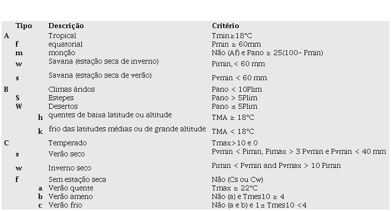 Chaves para a classificação do clima conforme Köppen e Greiger