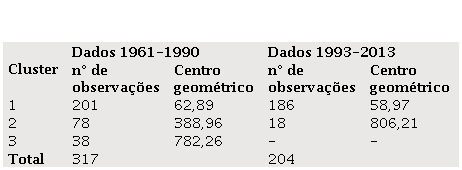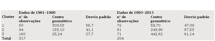 O primeiro agrupamento a ser testado foi o com três grupos. Após o agrupamento gerado, avaliou-se a não existência de dados que apresentam comportamento diferenciado da média, os chamados outleirs. Para os dados de 1961-1990, nesta proposta de agrupamento, conforme a Tabela 2, a concentração de cidades no Grupo 3 e um desvio padrão alto para todos os três conjuntos, o que permite concluir que essa divisão é pouco representativa, indicando a necessidade de um número maior de grupos. Para os dados de 1993-2013, a concentração de cidades em um único grupo não foi observada, contudo o desvio padrão alto para todos os três conjuntos também foi observado para estes dados.