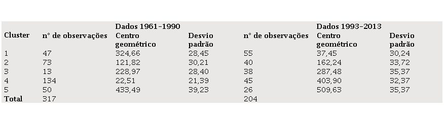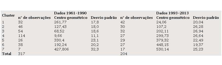 Fonte: Elaboração própria.A divisão dos dados em sete grupos, embora tenha apresentando uma redução no desvio padrão, originou cluster com apenas sete cidades (Cluster 7) para os dados de 1961-1990, sendo este número de observações pouco significativo para o universo trabalhado de 317 cidades. Por isso, pode-se dizer que este grupo é pouco representativo. Em razão disto, adotou-se a divisão em cinco clusters para o agrupamento das cidades a partir da necessidade de resfriamento.