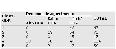 No caso do agrupamento das cidades de acordo com a necessidade de aquecimento, GDA, optou-se pela separação das cidades em apenas três grupos para a base de dados das Normais Climatológicas, devido ao predomínio do clima tropical no Brasil, havendo poucas cidades com significativa necessidade de aquecimento: sem necessidade de aquecimento, com baixa necessidade de aquecimento e com alta necessidade de aquecimento. Estes três grupos se fazem suficientes para abordar toda a amostra. Quando se agrupam as cidades em mais de três conjuntos, originam-se grupos pouco representativos que abrangem um pequeno número de cidades. No entanto, para a base de dados do INMET, apenas no caso do agrupamento em dois conjuntos não ocorreram grupos pouco representativos. Por isso, essa foi a divisão adota para GDA. O agrupamento das cidades conforme GDA está apresentado na Tabela 5.