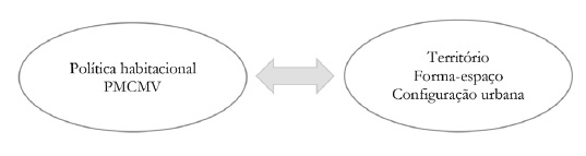 A partir da hipótese de que as características comprometidas de urbanização continuam a se reproduzir nas cidades do Brasil, a despeito da literatura abundante e conhecimento técnico sobre o tema, analisa-se de que maneira o PMCMV se relaciona com a estrutura urbana, em termos de segregação e integração espacial (acessibilidade entre partes), a partir das variáveis advindas da Teoria da Lógica Social do Espaço. Ou seja, busca-se investigar as relações entre território e a política habitacional, por meio da configuração da cidade (Figura 1).