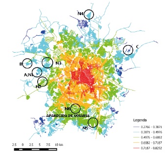 Considera-se importante ponderar que, se por um lado a proximidade dos empreendimentos a vias com elevado potencial de fluxo tende a revelar facilidade no acesso a transporte coletivo, por outro lado, há que se levar em conta as características locais do canal de comunicação. Ou seja, um empreendimento nas proximidades de uma rodovia (por exemplo) pode revelar facilidades de acesso a transporte coletivo, mas fragilidades de conexão com o tecido urbano em nível local, conforme explorado na seção a seguir.