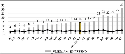 Fonte: Elaboração própria.Os dados apresentados no gráfico estão ordenados considerando a diferença entre esses valores, ou seja, no caso de Florianópolis/SC a diferença entre a média de empreendimentos e a média do sistema é mínima, diferentemente do caso de Porto Velho/RO, em que alcança um valor significativo. São dados de características locais e sabe-se que há uma vigorosa associação entre a forma de articulação das malhas viárias e os potenciais de acessibilidade encontrados para cada eixo em um mapa axial (Medeiros, 2013).