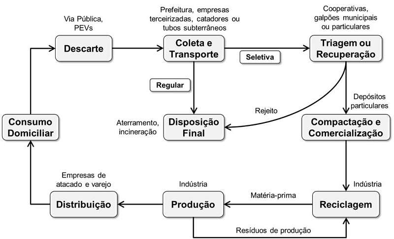 Muito associada à separação e à reciclagem, a coleta seletiva não é apenas um recolhimento diferenciado do lixo e sim um ciclo que se inicia com a geração e descarte do resíduo e se completa com o material reciclável sendo reempregado em um processo produtivo (Grimberg & Blauth, 1998; IBAM, 2001). O processo (Figura 1) é iniciado após o consumo domiciliar de algum produto ou serviço cujos resíduos gerados são dispostos na frente das casas, nos logradouros públicos ou em Pontos de Entrega Voluntária (PEVs). Alguns domicílios podem pré-selecionar os resíduos e os acondicionar de forma a garantir a integridade dos materiais potencialmente aproveitáveis. A etapa seguinte é a coleta propriamente dita: na modalidade regular, veículos coletores municipais ou de empresas terceirizadas transportam o lixo ao seu local de disposição final (aterro sanitário, usina de incineração, lixão etc.), terminando assim o ciclo; na seletiva, a coleta pode ser feita porta a porta (quando os veículos coletores oficiais ou catadores recolhem os resíduos deixados nos logradouros públicos) ou por meio dos PEVs (caçambas, contêineres ou lixeiras de fácil acesso nas quais os cidadãos entregam materiais recicláveis ou os trocam por alimentos, material de construção, material escolar, descontos para eventos culturais etc.) (CEMPRE, 2010; IBGE, 2010; Tchobanoglous & Kreith, 2002). Um terceiro método, raro no Brasil, ocorre por meio de um sistema subterrâneo: os resíduos são depositados em recipientes localizados abaixo do solo e transferidos até as centrais de triagem por caminhões com guindaste ou por tubulações (Kaliampakos & Benardos, 2013).