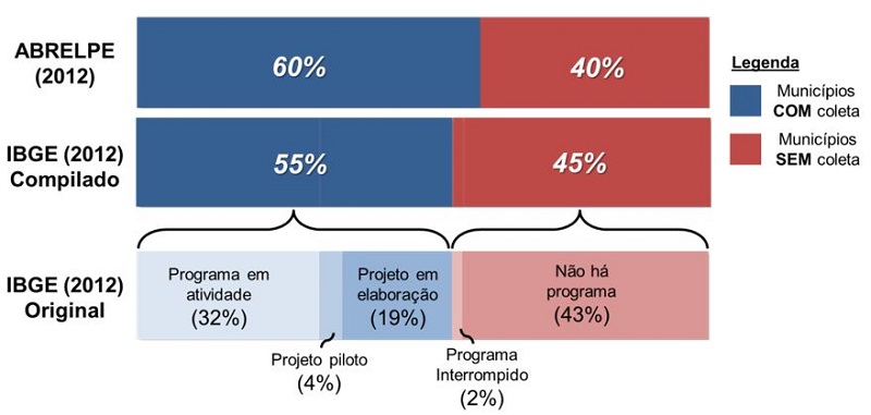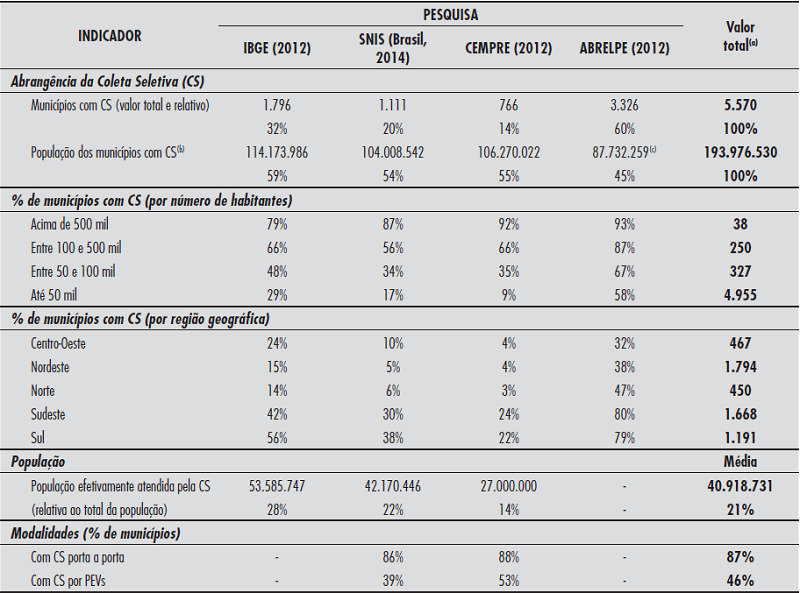 A primeira – e talvez a principal – informação sobre a situação da coleta seletiva no país é uma das que apresentaram maior contraste entre as pesquisas: de acordo com o CEMPRE (2012), 14% dos municípios brasileiros possuem programas de coleta seletiva; segundo o SNIS (Brasil, 2014) eles são 20%; para o IBGE (2012), 32%; e para a ABRELPE (2012), 60% das cidades brasileiras oferecem o serviço. Uma análise unificada das respostas indicou que, na hipótese mais otimista, o serviço estaria presente em 2.283 cidades (41% do total)3. Apesar de representar “o melhor dos casos”, esse número é ainda bastante inferior à cobertura da coleta regular, que chega a quase 98% dos municípios (IBGE, 2010).