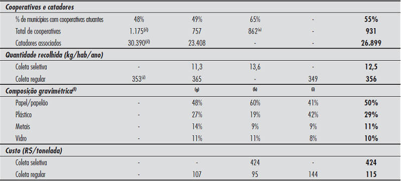 Cada tipo de resíduo separado e recolhido seletivamente deve ser direcionado ao tratamento mais adequado. Como recicláveis secos e matéria orgânica têm destinos e preços distintos, a composição gravimétrica torna-se uma informação relevante na análise da coleta seletiva. Nesse indicador houve maior dificuldade de compatibilização dos dados, pois as instituições usaram bases diferentes: o SNIS (Brasil, 2014) contabilizou os resíduos enviados à reciclagem; o CEMPRE (2012) mensurou aqueles coletados seletivamente; e a ABRELPE (2012), os coletados de modo regular. Conjuntamente, eles mostram que, no Brasil, a matéria orgânica representa mais de 50% do total de resíduos domiciliares. Considerando somente os recicláveis secos, quase 80% do material recolhido (e não gerado) são compostos de papel, papelão e plástico.