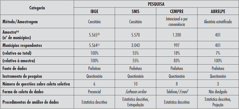 As pesquisas assemelharam-se quanto às fontes de informações, que foram as prefeituras ou seus setores responsáveis pela gestão de resíduos. O instrumento de coleta foi o mesmo – o questionário – alterando-se a forma de aplicação. Os pesquisadores do IBGE realizaram contatos presenciais com respondentes previamente identificados; o SNIS disponibilizou um aplicativo on-line, avisando a prefeitura no início do processo e novamente a contatando para a correção ou inclusão de algum dado inconsistente ou faltante; o CEMPRE obteve as respostas por telefone e e-mail; a ABRELPE não foi clara quanto ao procedimento exato adotado (presencial, e-mail, telefone ou outro).
