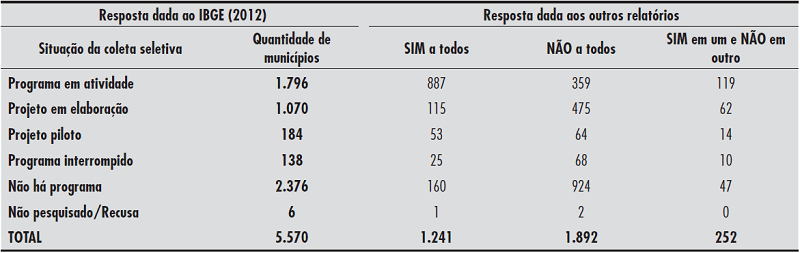 O acesso aos dados originais permitiu verificar a coerência das informações prestadas pelos municípios quanto à abrangência da coleta seletiva. As respostas dadas à pesquisa do IBGE (utilizada como base por ter obtido o retorno de todos os municípios brasileiros) foram confrontadas com aquelas fornecidas às outras pesquisas. Duas situações revelaram as divergências maiores: na primeira, 20% dos municípios que demostraram ao IBGE (2012) ter programas “Em atividade” responderam “não” (isto é, não possuem coleta seletiva) aos outros levantamentos dos quais participaram; na segunda, 7% dos que declararam ao IBGE (2012) que “Não há programa” deram a resposta “sim” aos outros relatórios, em clara contradição (Tabela 2).