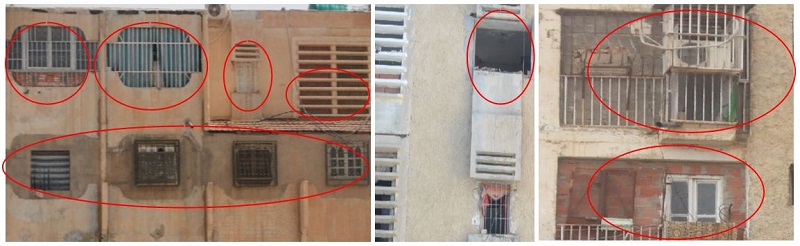 Donc, l’intériorisation des façades (Scott, 2008; Kynoch, 2008; Droettboom et al., 1971) par la pratique de la “résidentialisation”6, afin de préserver l'intimité du foyer, entre autres, a été adoptée d'une manière quasi systématique par la majorité des habitants dans les ZHUN algériennes. Esthétiquement, de tels manouvres aboutissent en fin de compte à une image choquante mais acceptable parfois (Figure 5).