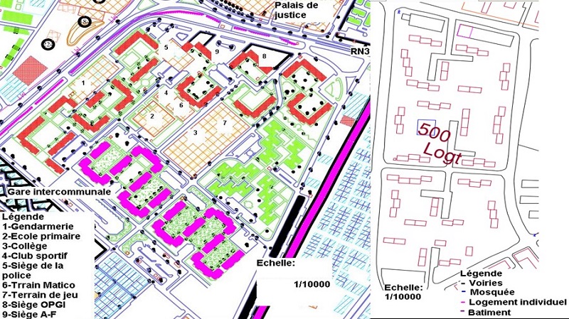 L’installation des équipements publics de L’OPGI, la Gendarmerie, siégé de la police et dans la périphérie Ouest, est au nord de la cité.