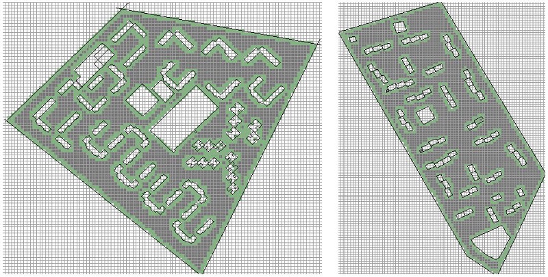 La figure ci-dessus montre le maillage des deux cités pour avoir une bonne résolution; ces derniers sont: (5 m) pour la cité 500 logt et (7) m pour la cité 1000 logt.