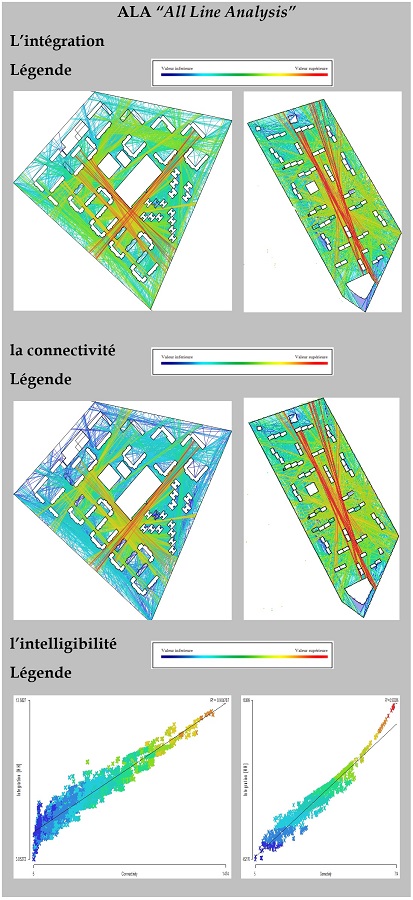 ALA: “All Line Analysis”: Il permet d’étudie la structure axiale théorique de l'espace ouvert, (qui représente l’espace continue du champ de visibilité possible) par apport à celui utilisé par les piétons.