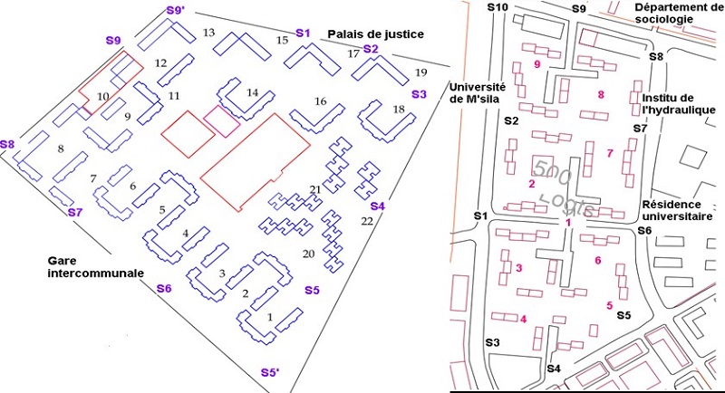 Dans le cas de la cité 1000 logt, nommée, El-Amel. C’est une cité collective très connue dans la ZHUN-Ouest de la ville de Biskra. En outre, la cité 500 logt à M’sila, occupe une place importante au centre de la ZHUN Ouest, à proximité de l’université (Figure 7).