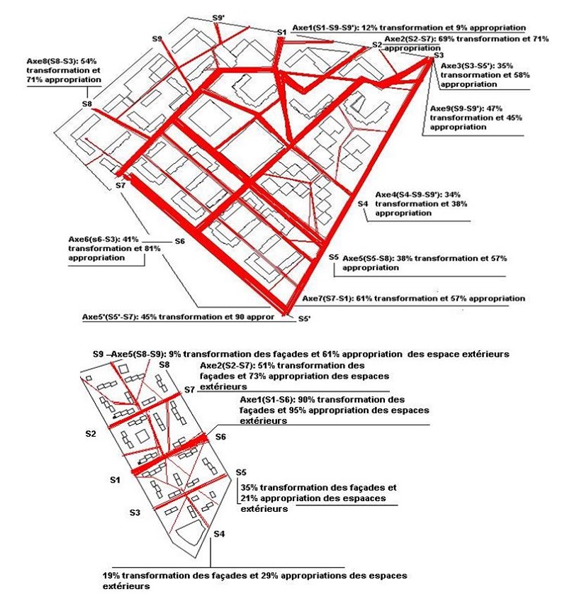 Il s’agit ainsi d’un dysfonctionnement causé par des mouvements piétons étrangers lequel ont engendrés les modifications de l’espace urbain en question; c’est ainsi, que des pratiques des transformations des façades et l’appropriation des espaces extérieurs constatées massivement sur les axes les plus fréquentés par les piétons non familier à la cité (Semmoud, 2009).