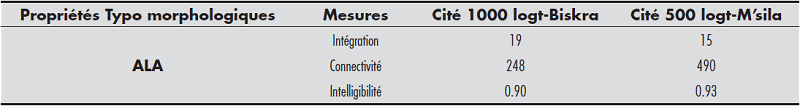 Le système des deux cités est considéré intelligible par deux valeurs presque identiques (0.93) dans le cas de la cité 500 logt-M’sila et (0.90) dans le cas de la cité 1000 logt-Biskra Le (Tableau 2) montre les mesures pics de la (ALA) des deux cités.