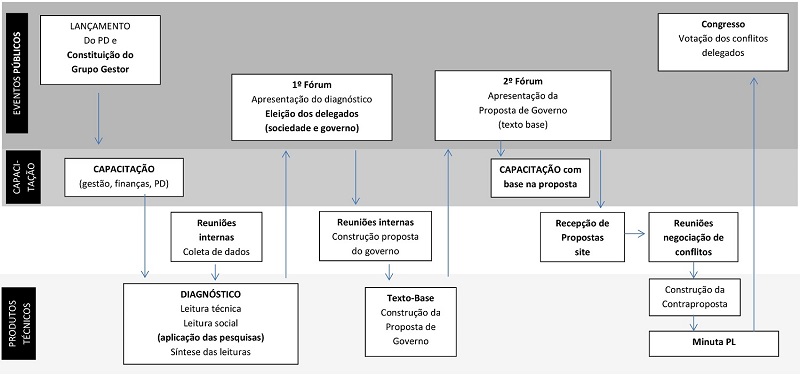 Na preparação do processo, é constituído um primeiro grupo, denominado gestor, com o objetivo de acompanhar e legitimar a construção do processo. Esse grupo é indicado pelo governo e possui representantes dos mais diversos segmentos sociais.