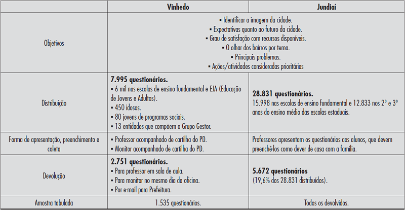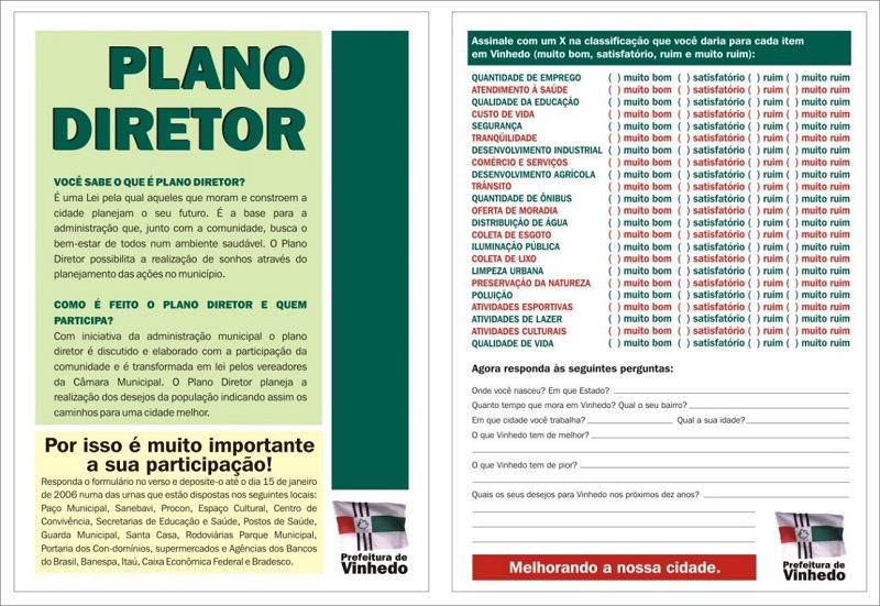 Nos processos desenvolvidos em Vinhedo e Jundiaí, foram realizadas três pesquisas para a elaboração da leitura comunitária, trazendo a percepção do público em geral e dos segmentos organizados. A primeira foi realizada com um formulário curto, que incluiu uma breve explicação sobre o PD, distribuído com as contas de água, entregue em toda a cidade, para as economias residenciais e comerciais de devolução voluntária. O objetivo dessa pesquisa foi essencialmente sensibilizar a população para a participação no processo de elaboração do PD, informar que o processo de revisão da legislação estava em andamento e introduzir o tema na cidade. As perguntas procuravam levantar a identificação de traços da imagem da cidade percebidos pela população, as expectativas quanto ao futuro da cidade e o grau de satisfação com recursos municipais e serviços públicos disponíveis. A Figura 2 é um exemplo do instrumento utilizado em Vinhedo. À esquerda, uma breve explicação sobre o que é o PD; à direita, um formulário de rápido e fácil preenchimento e com perguntas abertas.