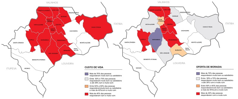 A Figura 3 exemplifica a importância da espacialização por bairros e apresenta diferentes resultados. À direita, estão as respostas sobre o nível de satisfação quanto à oferta de moradia, que varia conforme o bairro; à esquerda, vemos os resultados sobre custo de vida, homogêneos em toda a cidade.