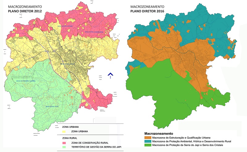 Em Jundiaí, no mapa de 2012, a macrozona urbana equivale ao perímetro urbano. No mapa de 2016, destacam-se os trechos oeste, sul e nordeste, nos quais houve a reversão dessas áreas, mantendo o uso rural graças à pressão dos produtores rurais que, na segunda audiência pública realizada pela Câmara, ocuparam as imediações do prédio com 70 tratores8.