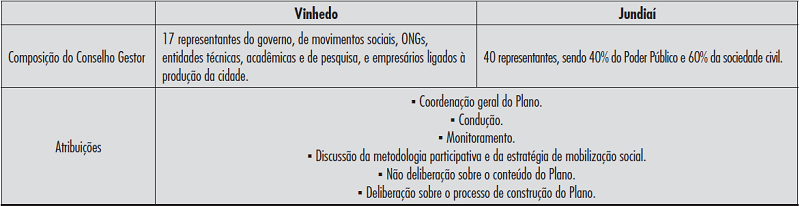 O processo de sistematização e de discussão até a votação das propostas no Congresso da Cidade levou cinco meses no caso de Vinhedo e 12 meses em Jundiaí (Quadro 7).