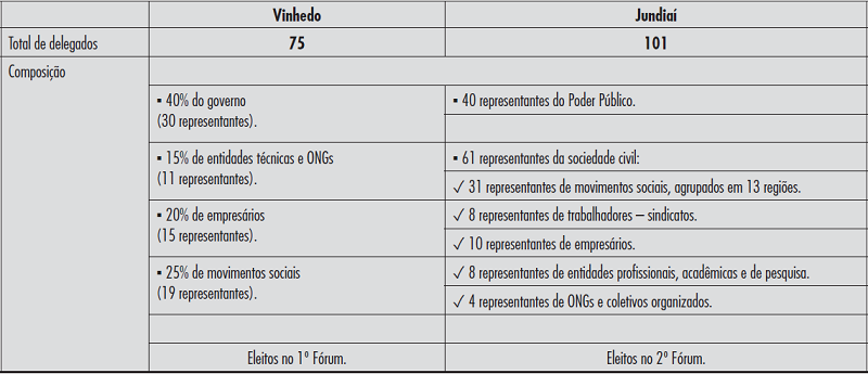 A eleição dos delegados para o Conselho Deliberativo (Quadro 2) deverá acontecer depois da apresentação do diagnóstico, antes do início da discussão das propostas. No caso de Vinhedo, os delegados foram eleitos oito meses após o início do processo; em Jundiaí, 11 meses depois.