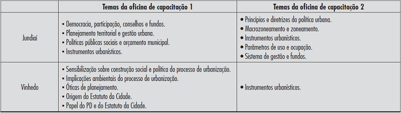 Nos casos analisados, as capacitações (Quadro 3) foram oferecidas aos representantes dos conselhos municipais e também aos delegados eleitos, incluindo temas, como a construção de instâncias democráticas na gestão urbana, o conhecimento sobre a organização política municipal (Executivo, Legislativo e Judiciário) e a montagem e fonte de recursos do Orçamento Municipal. As atividades foram estruturadas tendo como referência o próprio município.