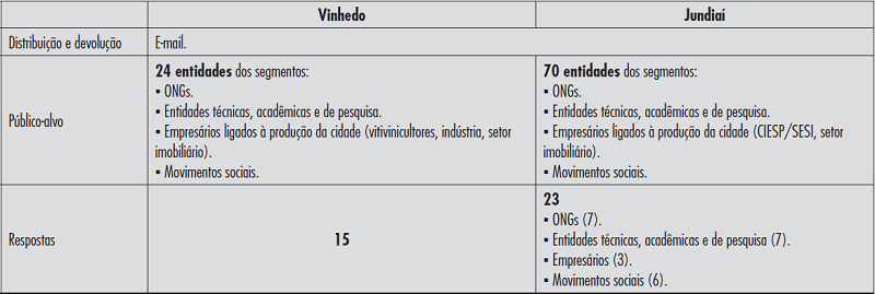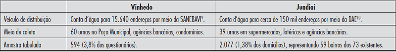 A primeira pesquisa teve devolução voluntária, nos meses de dezembro/2005 e janeiro/2006 em Vinhedo e março/maio de 2014 em Jundiaí. Permitiu levar a consulta a toda a cidade. Estatisticamente, a pesquisa resultou em amostra válida, inclusive por bairros (Quadro 4). Proporcionou à equipe captar percepções distintas sobre a cidade em geral e em relação a cada bairro, no que se refere à imagem e à avaliação dos serviços urbanos.