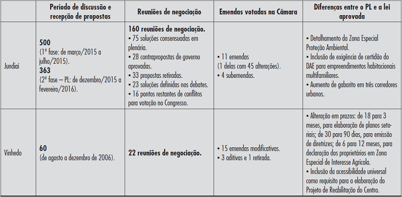 Mesmo assim, em Jundiaí, os vereadores propuseram 72 emendas ao texto de lei. O Executivo as classificou quanto ao impacto técnico que causariam ao projeto original em três categorias: impacto (sem, pequeno e grande), modificação pontual e contrária ao processo participativo. Trinta e seis dessas emendas contrariavam deliberações do projeto original. Dessa forma, foi possível que os delegados compreendessem as negociações em pauta, mobilizando-se para interferir e pressionar a Câmara. Esse processo garantiu que nenhuma modificação de grande impacto fosse aprovada.