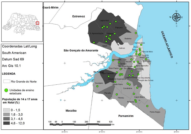 Conhecer a caracterização da distribuição espacial da população em idade escolar no município é importante do ponto de vista demográfico, pois interfere em várias esferas sociais, dentre elas a educação, visto que o entendimento das questões demográficas pode servir de subsídio para o planejamento educacional (Adarosa & Szmrecsányi, 1980). A partir da Figura 1, observa-se que bairros como Nossa Senhora da Apresentação, Lagoa Azul, Pajuçara, Potengi e Felipe Camarão concentram entre 4,6% a 12,0% do total da população de 14 a 17 anos do município. Isso é, grande parte em idade potencial de frequentar o nível médio da educação básica.