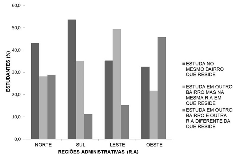 A partir do banco de dados do Censo Escolar 2012 (INEP, 2013), foi possível relacionar as variáveis referentes ao bairro de residência do aluno e ao bairro de localização da escola em que ele estuda. Observou-se que quase metade (46%) dos estudantes da Região Administrativa (R.A.) Oeste frequentavam escolas fora da sua R.A. de residência, 32% frequentavam escolas localizadas no mesmo bairro em que residiam e a menor parcela desses estudantes (22%) frequentava escolas em outros bairros mas na mesma R.A. em que moravam.