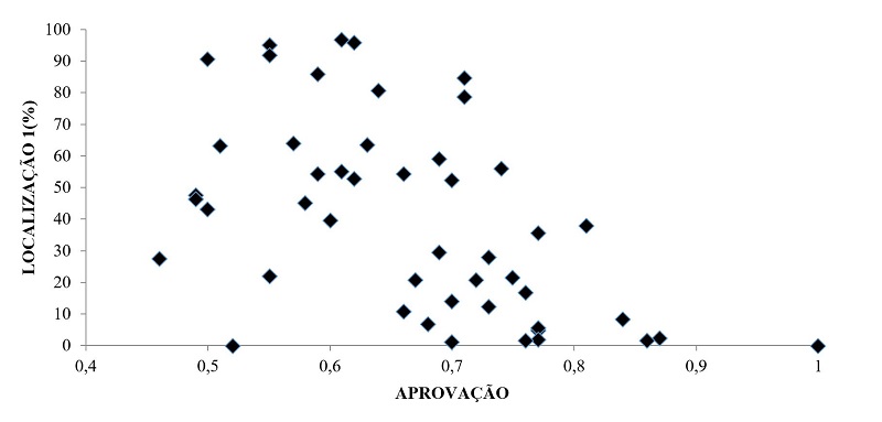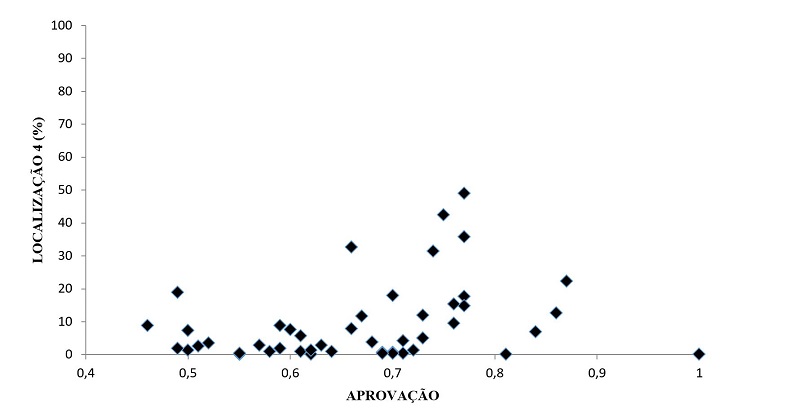 As Figuras 3 e 4 mostram essa relação. Na Figura 3, a relação é inversa (r = -0,5196; p-valor = 0,000), mostrando que as escolas com maior proporção de alunos aprovados no ensino médio possuem menor percentual de alunos que residem no mesmo bairro. Por outro lado, tomando o outro extremo da variável “localização”, que são aqueles estudantes que, apesar de estudarem em escolas de Natal, residem fora do município, a Figura 4 mostra inversão na relação (r = 0,3145; p-valor = 0,0295). Nesse caso, embora a relação seja mais fraca, ainda é significante. As escolas com maior proporção de alunos aprovados são as que apresentam maior percentual de alunos que residem em outro município. Tomando-se a proporção de aprovação como uma proxy de taxa de sucesso, uma medida de qualidade da instituição, ratifica-se a hipótese levantada a partir dos resultados da regressão logística, de que escolas melhores atraem alunos, com os estudantes e suas famílias avaliando as instituições de ensino e buscando aquelas com melhor estrutura.