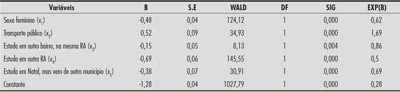As variáveis independentes utilizadas no modelo foram: “sexo”; “transporte público” (se utiliza ou não) e “localização” (se (1) mora no mesmo bairro onde estuda; (2) mora em outro bairro, mas na mesma Região Administrativa (RA); (3) mora em outro bairro e outra RA; e (4) mora em outro município. A variável resposta ou dependente, como já foi dito anteriormente, é o “rendimento escolar do aluno” (se ele está nivelado ou não em relação à série escolar em que está matriculado, isto é, a distorção idade-série)4. Inicialmente também foram incluídas as variáveis cor/raça e idade. No entanto, a partir da estatística de teste de Wald, elas foram não significantes, por isso retiradas da análise.