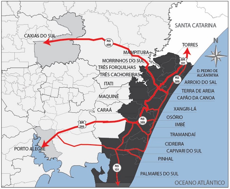 Dentre as principais rodovias, destacam-se a RS-486, conhecida como Rota do Sol, que liga a Serra Gaúcha ao Litoral; a BR-289, conhecida como Freeway, que liga o Município de Osório à Região Metropolitana de Porto Alegre, e a BR-101, que cruza diversos municípios do Litoral Norte e conecta o Rio Grande do Sul a diversos Estados brasileiros (Figura 2).