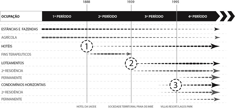 A ocupação do Litoral Norte, de 1888 a 2013, pode ser dividida em quatro períodos (Figura 3), cujos intervalos de duração são marcados por diferentes formas de se ocupar o território, bem como sua intensidade de ocorrência. Ressalta-se, entretanto, que os usos e as formas de ocupação de cada período identificado possuem inércias que levam esses usos e formas de ocupação a perpassarem por mais de um período, com intensidades diferentes, e a coexistirem com as novas ocupações.